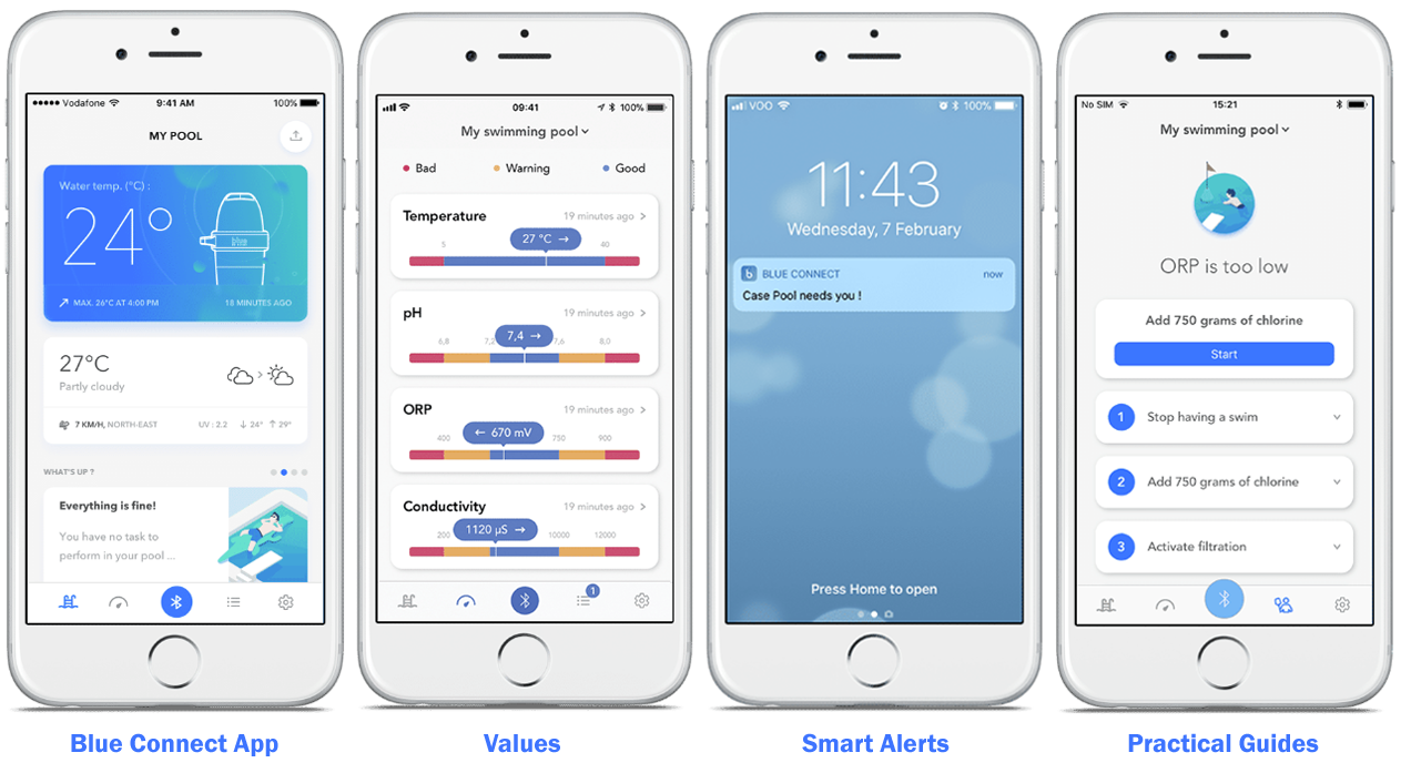 Blue Connect App: Enables information about a pool to be accessed in real time from a mobile device. The App can be downloaded free of charge and is available for iOS on the App Store and android smartphones on Google Play Store. There is a Blue Plus version with premium services and features.